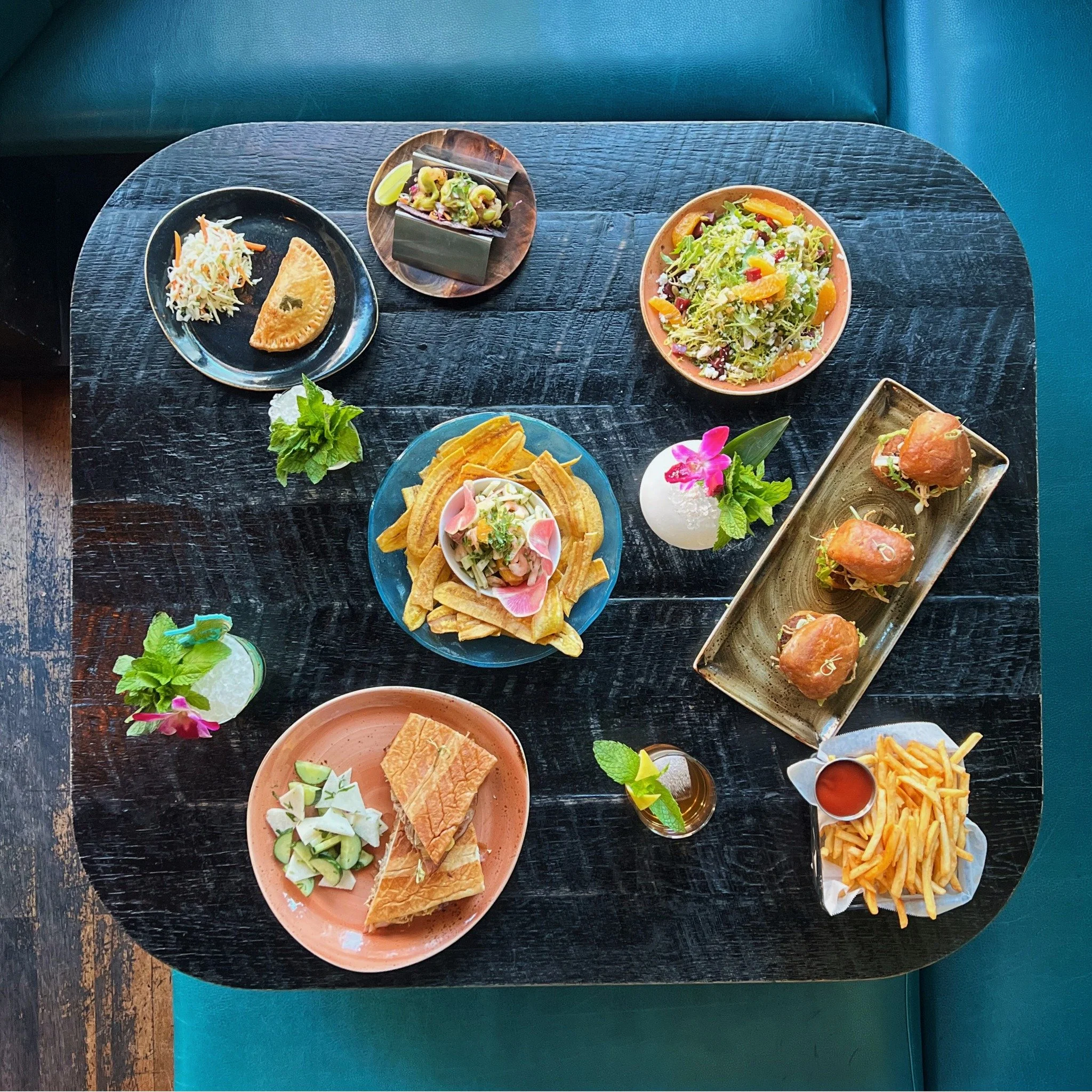 The first thing you notice when you enter the bar is the long, curved counter made of dark solid wood, which can seat up to 10 people, with a sea of bottles as a backboard. The style is classically solid, with dark wood tones generally dominating the look of the bar and aquamarine blue accents in the form of bar stools and seating to match the tropical theme.